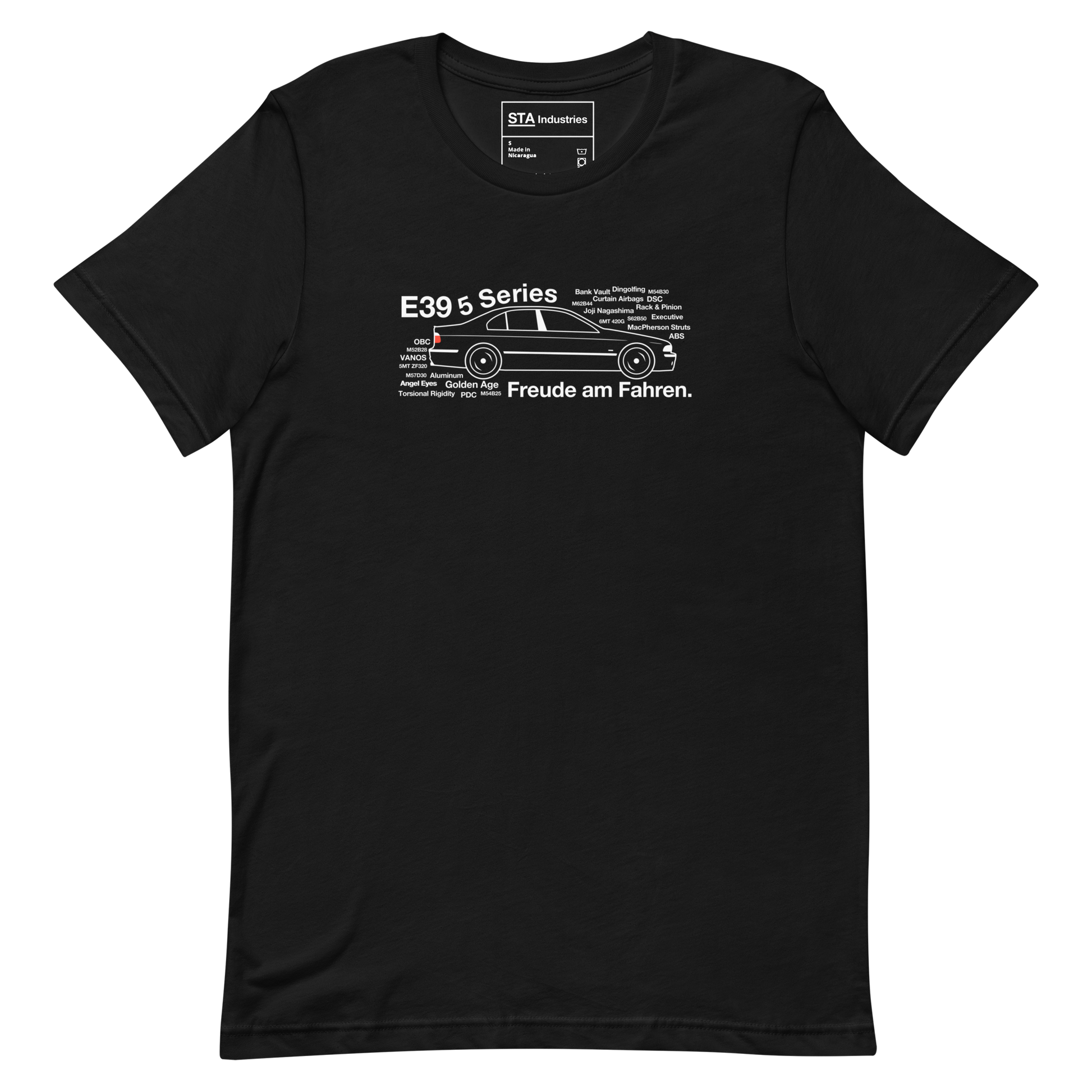 A silhouette of the E39 5 Series, surrounded by many of its key features.