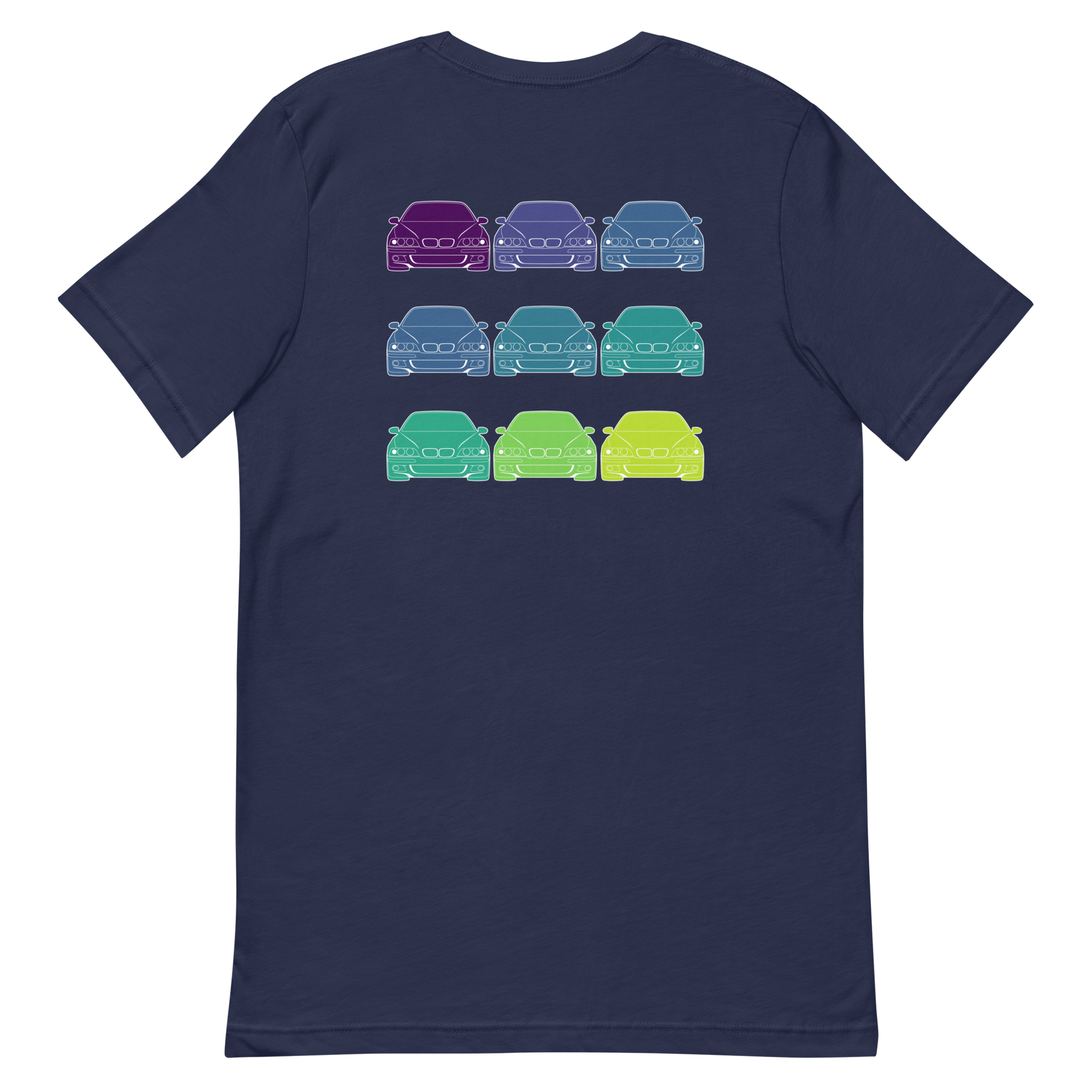 A 3x3 color palette featuring the iconic E39 front end. The front of the shirt features an E39 insignia to match the color palette on the back!